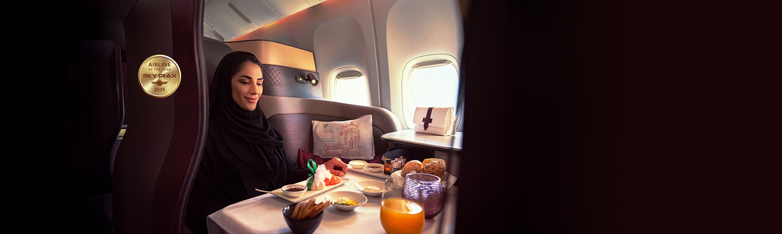 حلّق على متن الكيوسويت، أفضل درجة رجال أعمال في العالم، أو على متن الدرجة الأولى الفاخرة، واستمتع براحة لا تضاهى وخدمة استثنائية. احجز الآن تجربتك الأرقى في عالم الطيران.