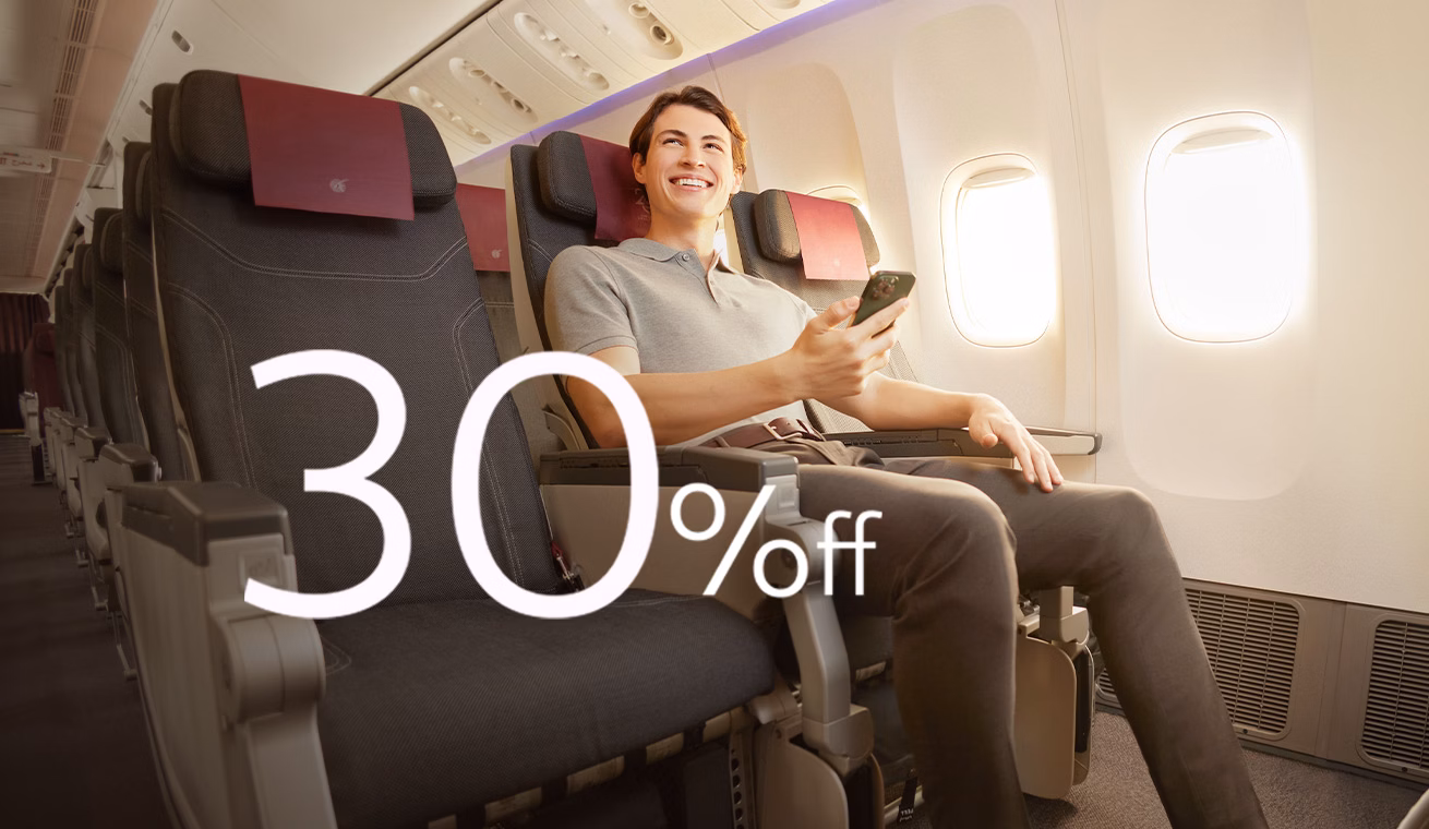 To get up to 20% off*, book on qatarairways.com or our mobile app. Then fly to any of our destinations worldwide to explore blue seas, white mountain tops and green fields that will take your breath away.